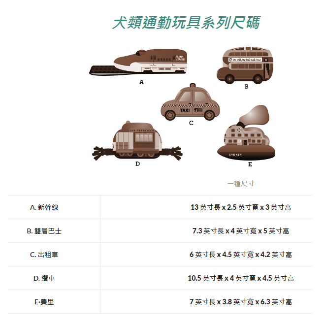 呃哦,玩耍時間遲到了?別擔心,您的小狗的 Canine Commute 毛絨狗玩具系列將立即讓他到達那裡!這款旅行玩具套裝包含東京子彈頭列車、紐約市出租車、舊金山纜車、倫敦巴士和悉尼渡輪狗玩具,這些狗玩具都有一個目的地;玩耍時間。無論您的小狗喜歡快車道上的生活還是喜歡風景優美的路線,這套毛絨玩具套裝都能讓他立刻玩起來。