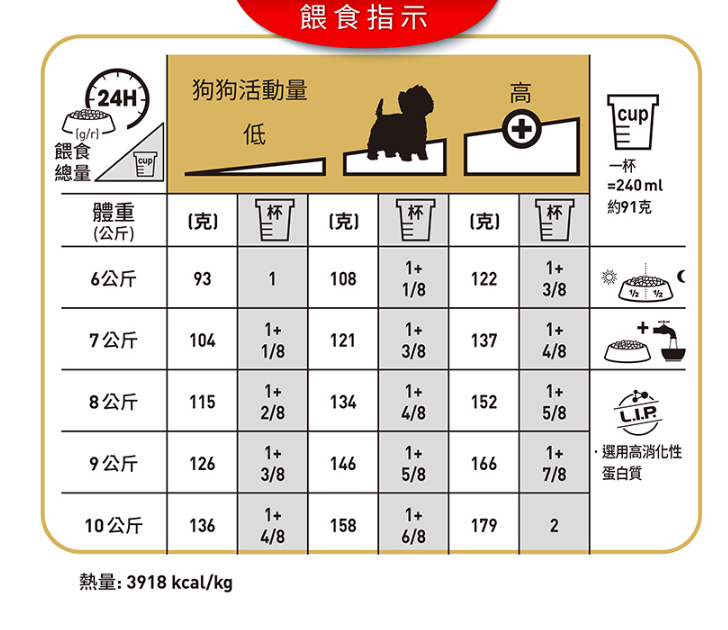 10個月以上西高地白爹利犬,與其他的犬種相比,西高地白爹利犬擁有較為狂野的毛髮以及細嫩的皮膚。配方中含有特定的氨基酸,能夠促進毛髮生長,而所含的琉璃苣油及亞麻籽中的脂肪酸成分則有助於皮膚健康。配方中含有獨家複合物,有助維持皮膚的“屏障”作用;亦含有EPA及DHA,能令皮膚狀態更健康。滿足挑剔胃口,配方的精選口味組合能夠滿足到最挑剔的胃口。獨特的顆粒設計:維護牙齒,含有的鈣螯合物有助於降低牙垢形成的風險。