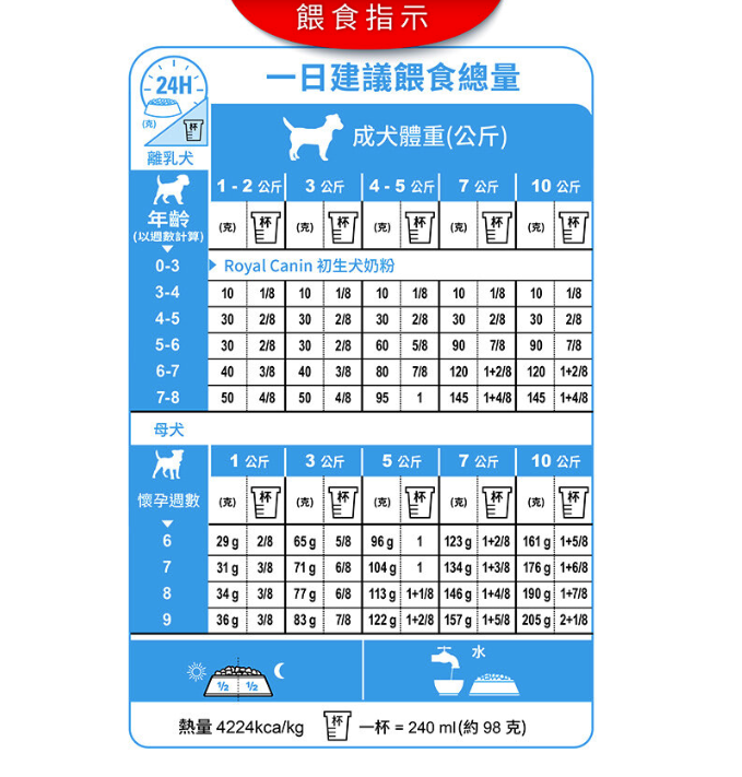 小型母犬(不超過 10 公斤)和牠的幼犬:妊娠末期和哺乳期的母犬 - 2 個月以下的斷奶幼犬。START COMPLEX獨家營養複合物配方是法國皇家持續專注於科學研究的成果,該獨特營養複合物包含許多母犬乳汁中的營養元素,並添加特殊營養成分,幫助幼犬維持消化道健康和發展自身抵抗力。易與水融合成粥狀,適合母犬和離乳期幼犬食用,更容易使幼犬從母乳期過渡到固體食物。懷孕期及哺乳期營養配方,營養成分適合母犬懷孕末期及哺乳期所需的極高能量需求
